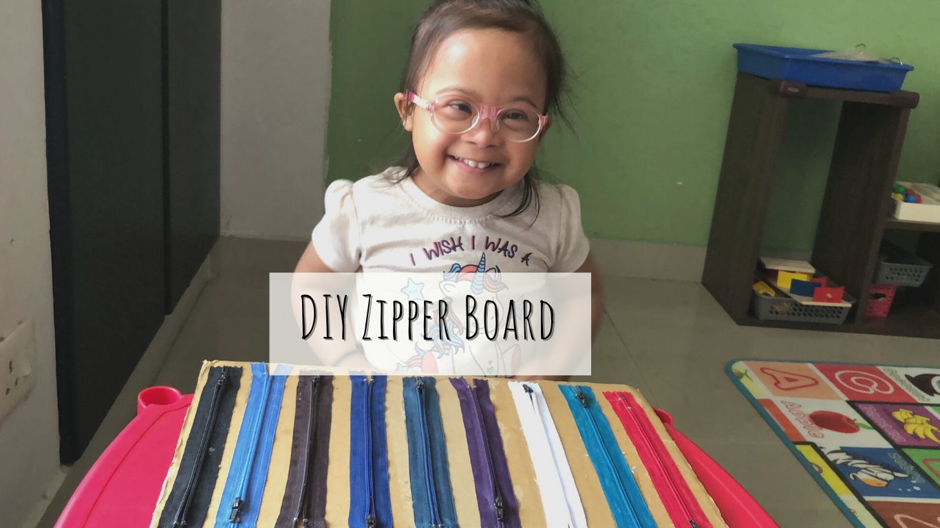 I made this Zipper Board a few years ago to improve Veda’s grip, fine motor skills and finger strengthening.